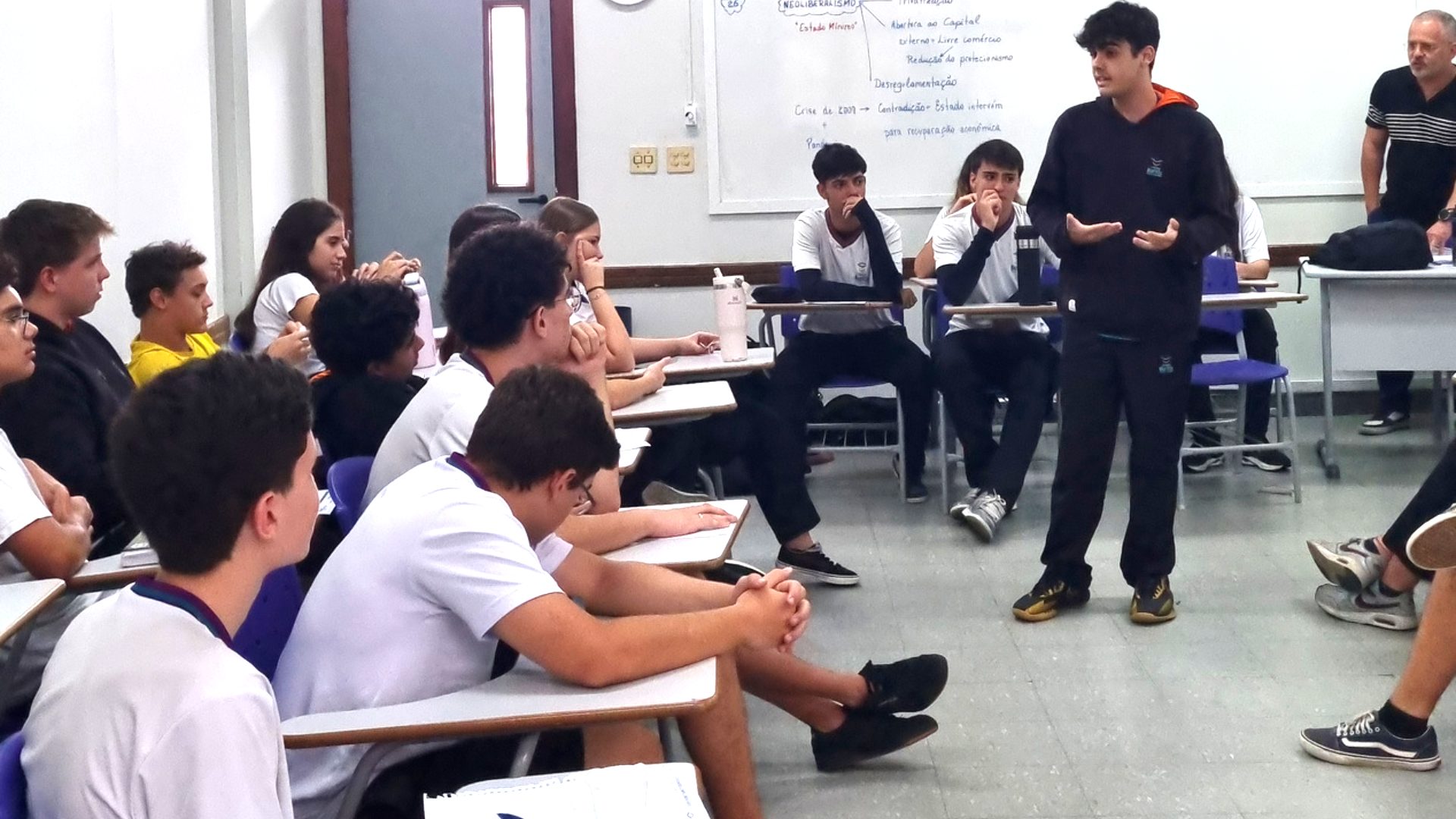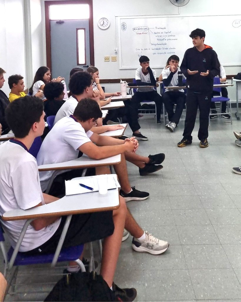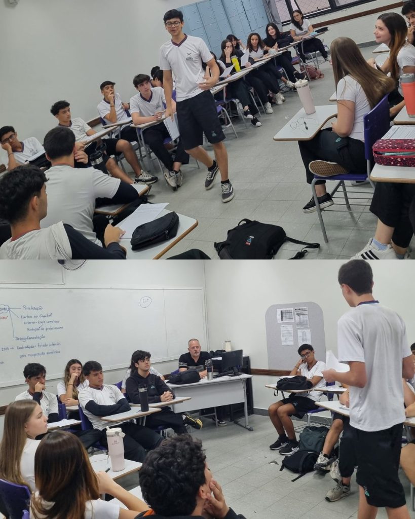 Os alunos da 2ª Série do Ensino Médio participaram de um júri simulado durante a aula de História, debatendo a temática do uso da tecnologia na sociedade contemporânea. A atividade convidou os estudantes a assumirem diferentes papéis, analisando argumentos, apresentando pontos de vista e defendendo suas posições com base em pesquisa e reflexão.